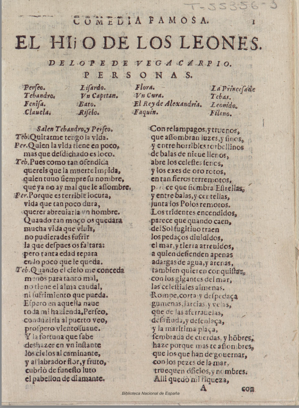 COMEDIA FAMOSA. / EL HIjO DE LOS LEONES. / DELOPE DE VEGA CARPIO. / PERSONAS./ [dram. pers. a 4 col.] / Salen Tebandro,y Perʃeo. /Teb. Quitarme tengo la vida. / Per.Quien la vida tiene en poco, / mas que de deʃdichado es loco. / [final:] Lif. Y aqui Senado diʃcreto / al hijo de los Leones / da fin nueʃtro buen deʃeo. / FIN.