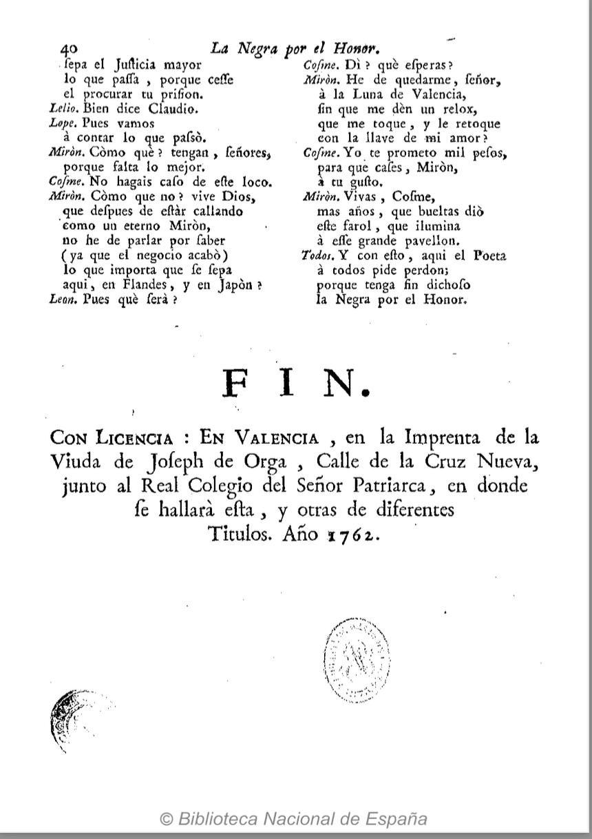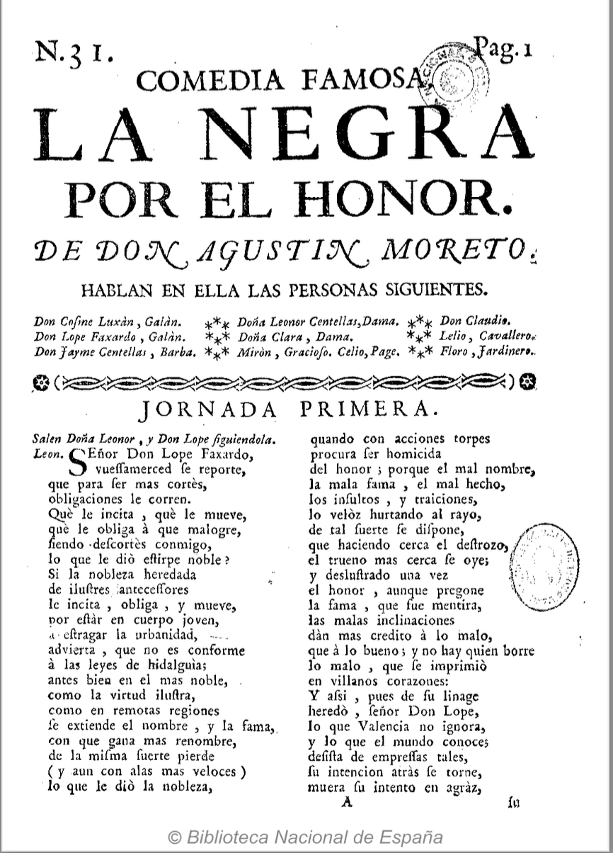 N.31. Pag.I / COMEDIA FAMOSA. / LA NEGRA / POR EL HONOR. / DE DON AGUSTIN MORETO. / HABLAN EN ELLA LAS PERSONAS SIGUIENTES. / [dram. pers. a 3 col.] /JORNADA PRIMERA. / Salen Doña Leonor , y Don Lope ʃiguiendola. / Leon. SEñor Don Lope Faxardo, / vueʃfamerced ʃe reporte, / [Final:] Todos. Y con eʃto , aquí el Poeta / à todos pide perdón; / porque tenga fin dichoʃo / la Negra por el Honor. / FIN. / CON LICENCIA : EN VALENCIA , en la Imprenta de la / Viuda de Joʃeph de Orga, Calle de la Cruz Nueva, / junto al Real Colegio del Señor Patriarca , en donde / ʃe hallarà eʃta , y otras de diferentes / Titulos. Año 1762.