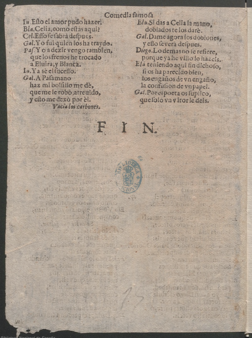 LA GRAN COMEDIA / FAMOSA/ LOS ENGAÑOS DE VN / ENGAÑO, Y CONFVSION DE VN / PAPEL. / De D. Aguʃtin Moreto y Cabaña. / Perʃonas que hablan en ella. / [dram. pers. a 3 col.] / IORNADA PRIMERA. / Salen D. Diego de Ribera, y Galon, veʃtidos / de camino. Traedon Diego dos pliegos / de cartas en la mano . / [Final:] Gal. Porelpoeta os ʃuplico, / que ʃolo vn vitor de deis. / FIN.
