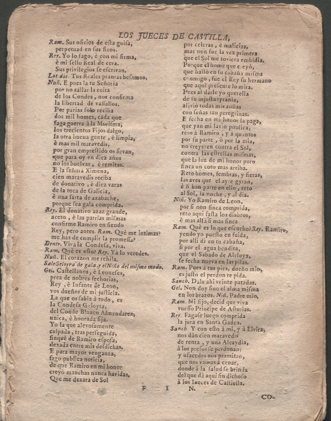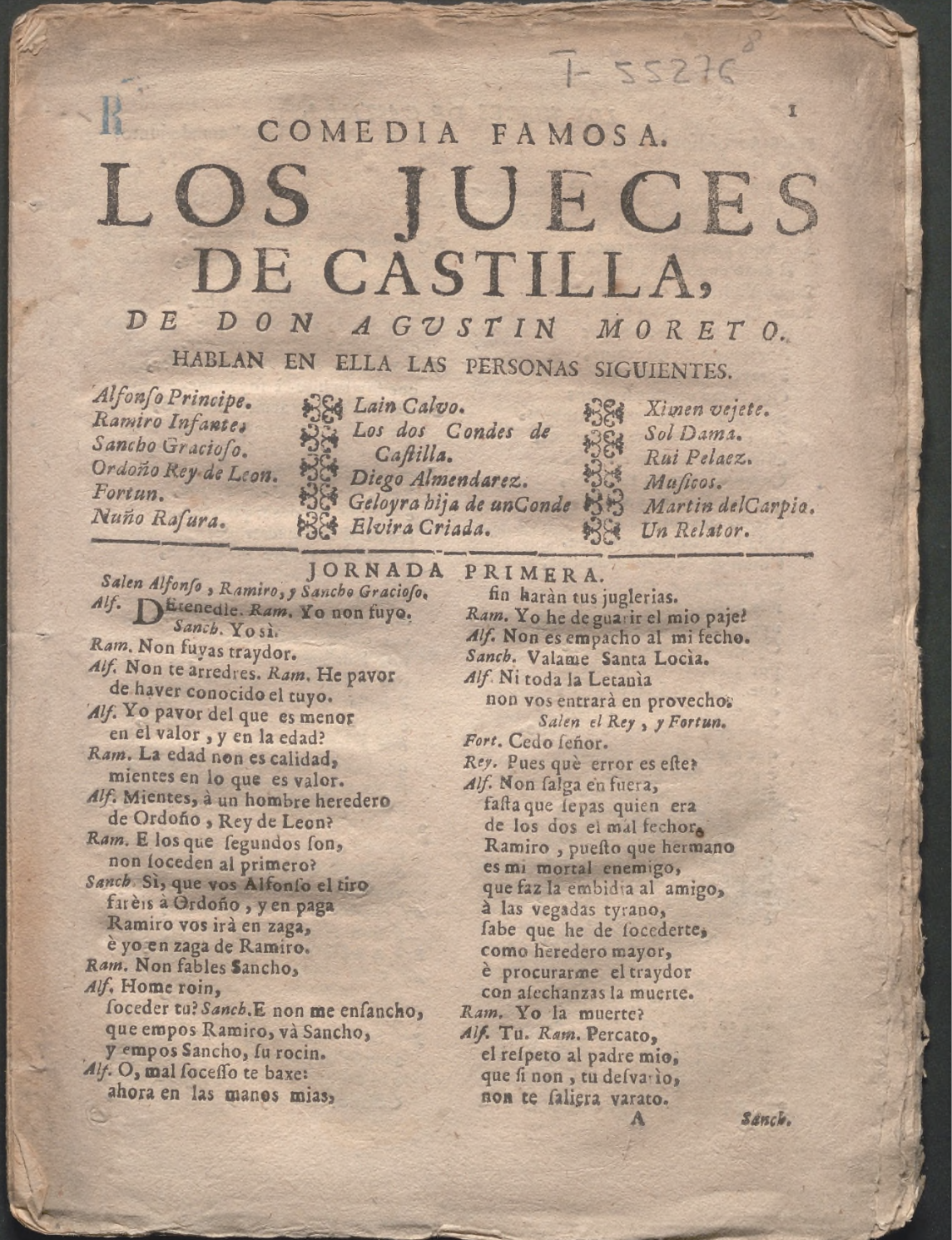COMEDIA FAMOSA. / LOS JUECES / DE CASTILLA, / DE DON AGUSTIN MORETO. / HABLAN EN ELLA LAS PERSONAS SIGUIENTES. / [dram. pers. a 3 col.] / JORNADA PRIMERA. / Sale Alfonso , Ramiro, y Sancho Gracioʃo. / Alf.DEtenedle. Ram. Yo non fuyo. / Sanch. Yo si. / [Final:] Sanch. Y con eʃto à mi, y à Elvira, / nos dàn cien maravedís / de renta , y una Alcaydía, / à los preʃos ʃe perdonan : / y uʃacedes nos permitan, / que nos vamos à cenar, / donde à la ʃalud ʃe brinda / del que dà aquí fin dichoʃo / à los Iueces de Caʃtiella. / FIN.