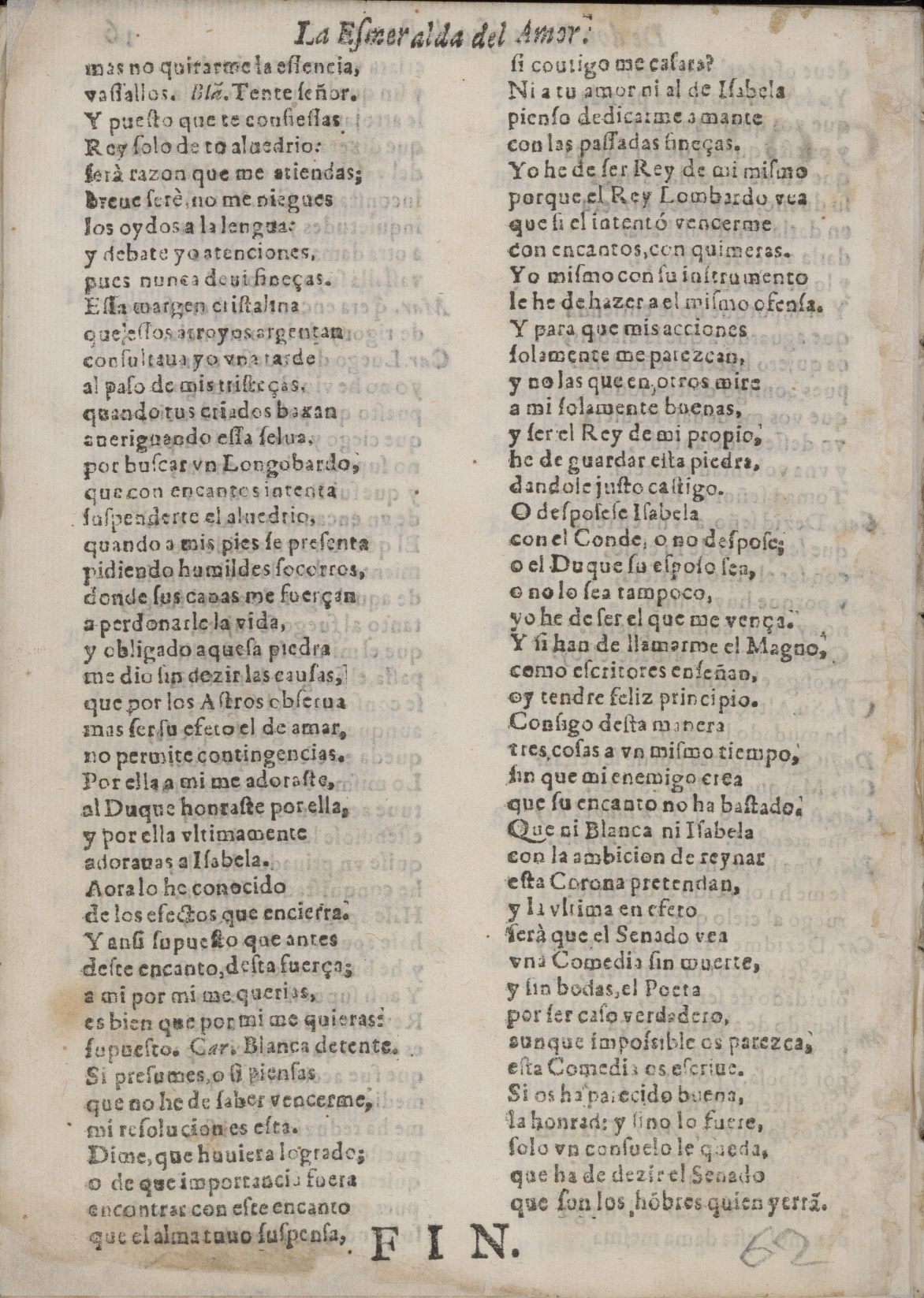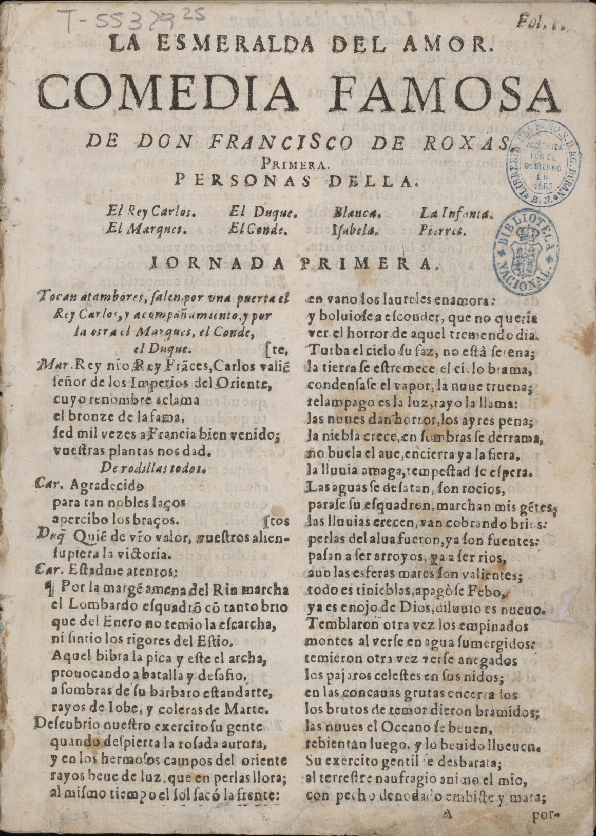 Fol. I / LA ESMERALDA DEL / AMOR. / COMEDIA FAMOSA / DE DON FRANCISCO DE ROXAS. / PRIMERA. / PERSONAS DELLA. / [Dram. pers. a 4 col.] / IORNADA PRIMERA. / Tocan atambores, ʃalen por vna puerta el / Rey Carlos, y acompañamiento, y por / la otra el Marques, el Conde, / el Duque. / Mar. Rey n´ro (nuestro), Rey Frãces, Carlos valiẽ[te / ʃeñor de los Imperios del Oriente,