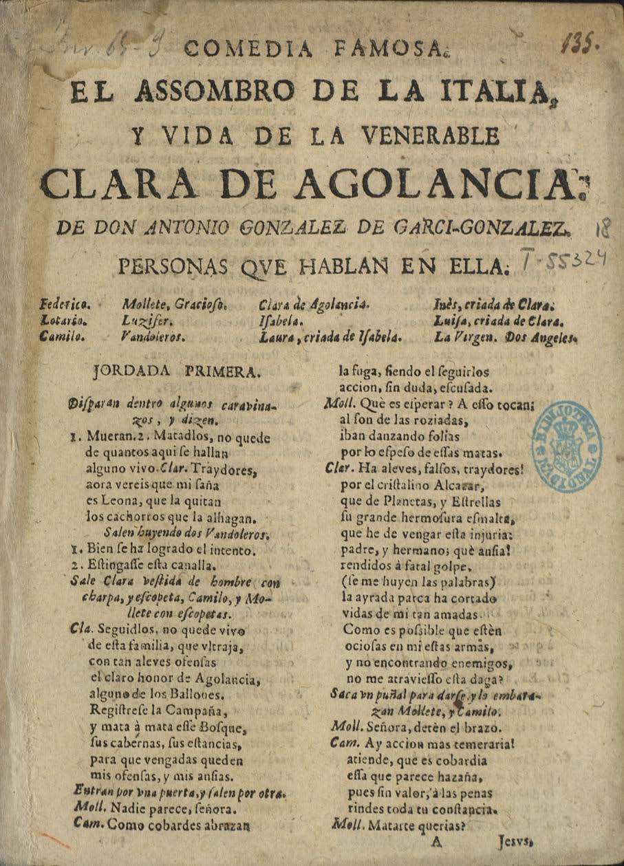 COMEDIA FAMOSA. / EL ASSOMBRO DE LA ITALIA, / Y VIDA DE LA VENERABLE / CLARA DE AGOLANCIA. / DE DON ANTONIO GONZALEZ DE GARCI-GONZALEZ / PERSONAS QVE HABLAN EN ELLA. / [Dram. pers. a 4 col.] / JORNADA PRIMERA. / Diʃparan dentro algunos caravinazos y dizen. / I. Mueran. 2. Matadlos, no quede / de quantos aqui ʃe hallan