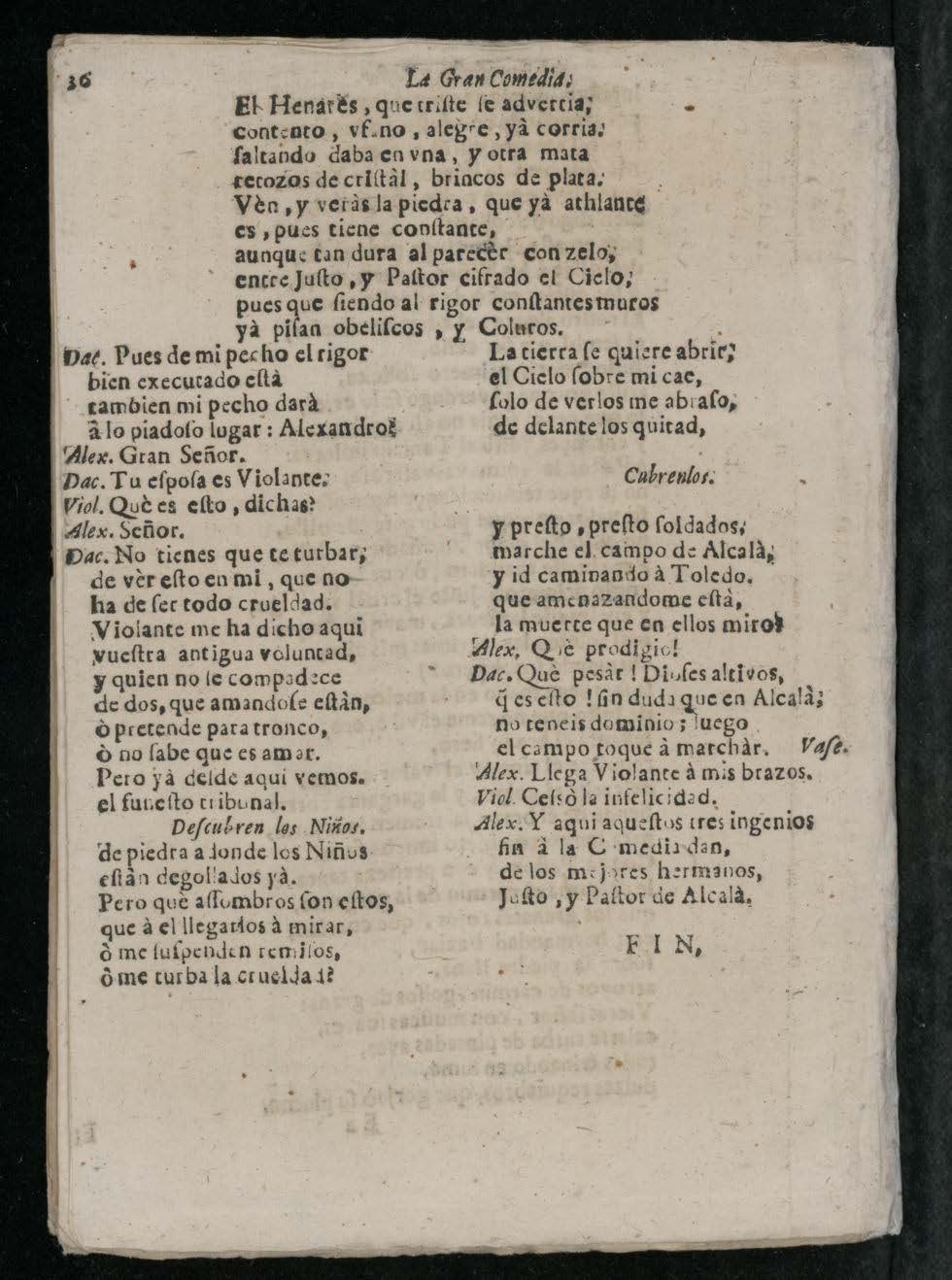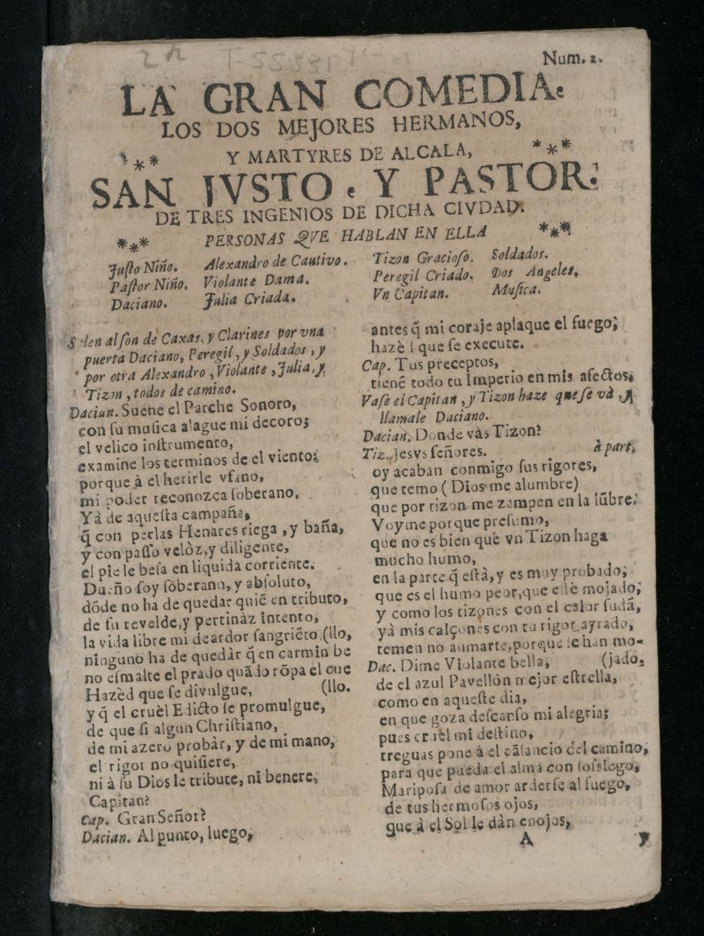 Num. 2. / LA GRAN COMEDIA, / LOS DOS MEJORES HERMANOS, / [asteriscos] Y MARTYRES DE ALCALA, [asteriscos] / SAN JVSTO, Y PASTOR. / DE TRES INGENIOS DE DICHA CIVDAD. / [asteriscos] PERSONAS QUE HABLAN EN ELLA [asteriscos] / [dram. pers. a 4 col.] / Salen al ʃon de Caxas y Clarines por vna /puerta Daciano, Peregil, y Soldados, y / por otra Alexandro, Violante, Julia, y / Tizon, todos de camino. / Dacian. Suene el Parche Sonoro, / con ʃu muʃica alague mi decoro; /