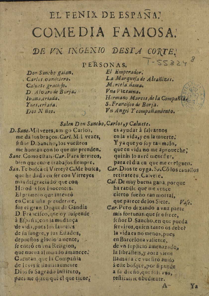 EL FENIX DE ESPAÑA. / COMEDIA FAMOSA. / DE VN INGENIO DESTA CORTE. / PERSONAS. / [dram. pers. a 2 col.] / Salen Don Sancho, Carlos, y Caluete./ D. Sanc. Mil vezes, amigo Carlos, / me dà los braços. Carl. Mil vezes, /